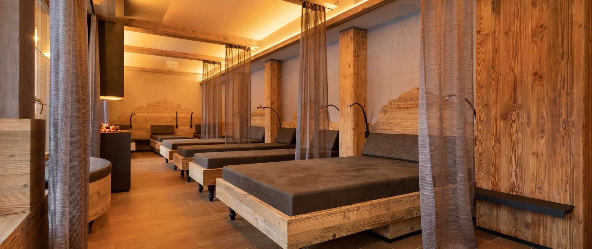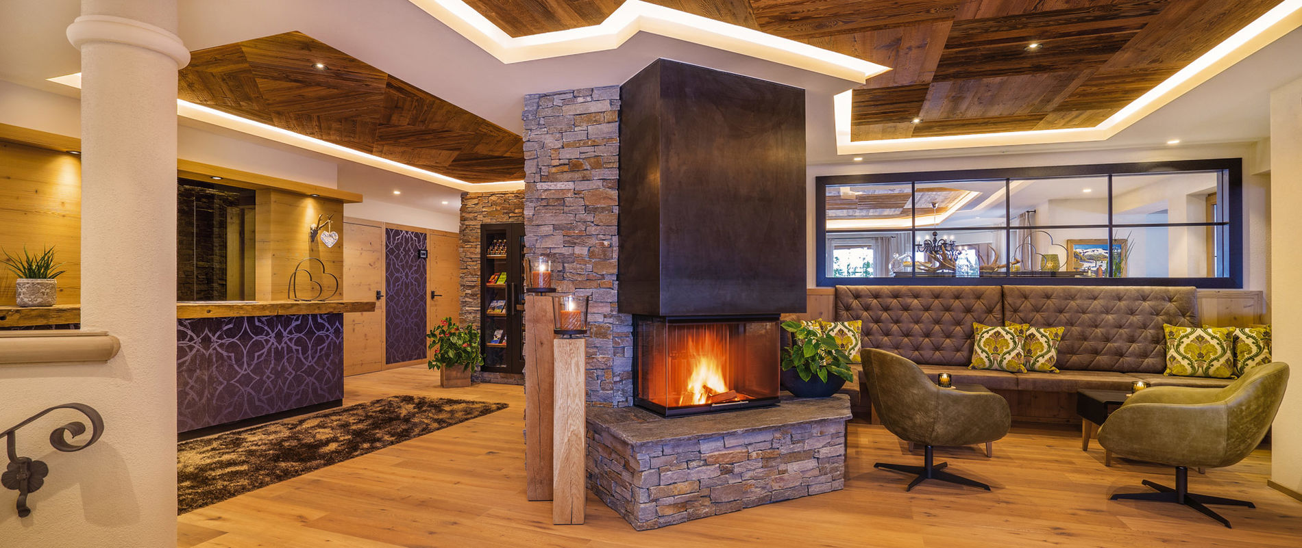 The attractive hotel lobby with its open fireplace is an inviting place to linger. Local wood gives the interior a cosy and natural feeling.
